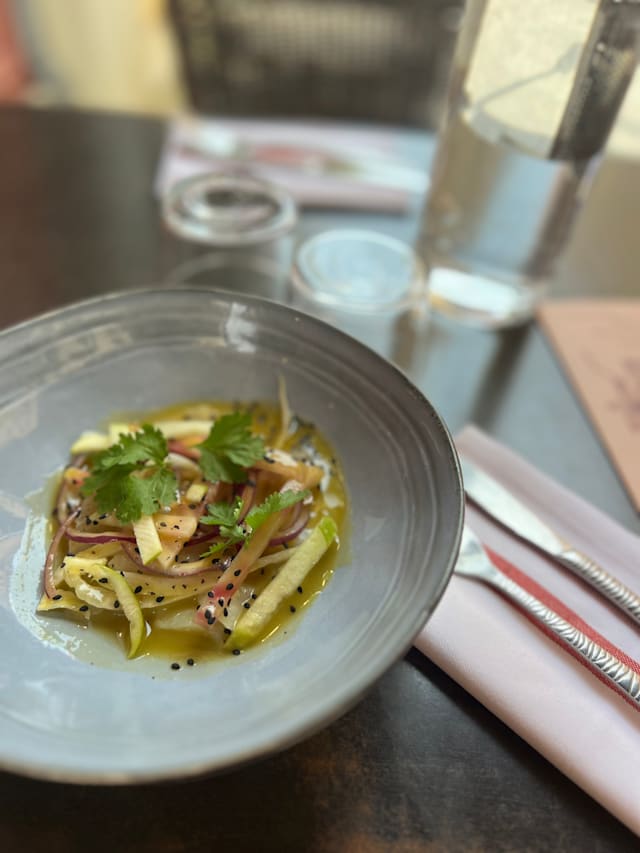Crème citron à l'huile d'olive, sablé à l'aneth, meringue italienne, concombre et gel gin fizz