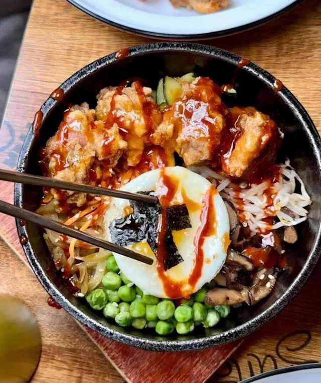 - Bibimbap au bœuf mariné / bibimbap au poulet mariné / bibimbap au porc mariné / bibimbap végétarien (au tofu) / bibimbap au poulet croustillant (bibimbap : riz recouvert de légumes variés, d'œuf et de viande.) (les horaires de service du déjeuner sont du lundi au vendredi de 12h00 à 14h30.)