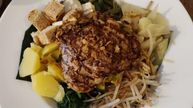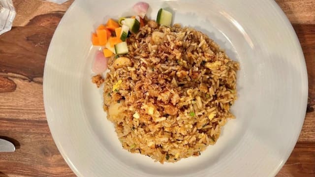 Riz sauté indonésien avec protéines au choix (poulet, boeuf, tempe) ou (crevettes +1€)