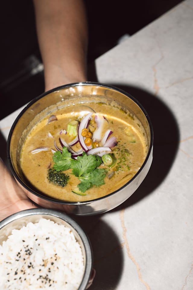 Curry cremoso de gambones, tomates cherries y verduras salteadas al wok. pica lo suyo, pero tranqui, para eso está tu mejor amigo el arroz