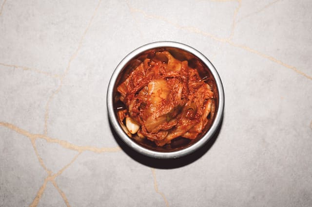 Costillas de cerdo a baja temperatura que se te deshacen en la boca, cubiertas de salsa koreana acompañadas de encurtido de pepino y kimchi casero