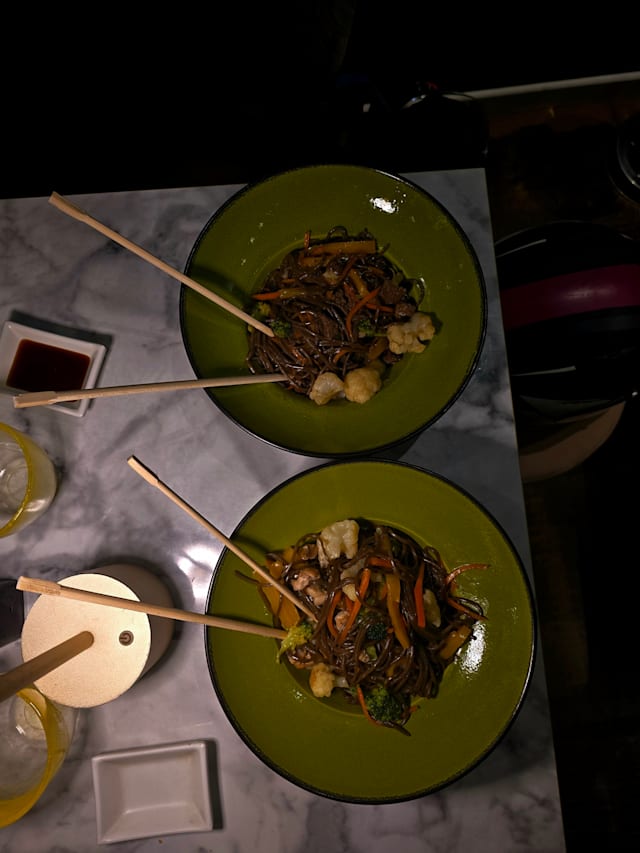 Spaghetti di grano saraceno giapponesi, cozze, cappesante, gamberi saltati peperoni gialli e rossi, broccoli, cavolfiori, carota, salsa di soia e olio di sesamo