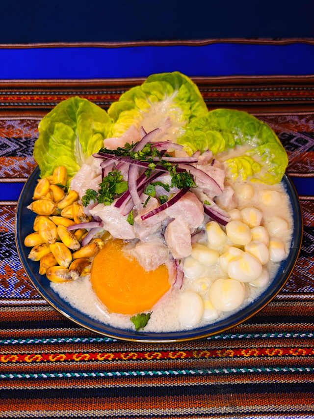 - Ceviche de ají amarillo con perca fresca, cremoso, picante y acompañado de maíz y boniato.