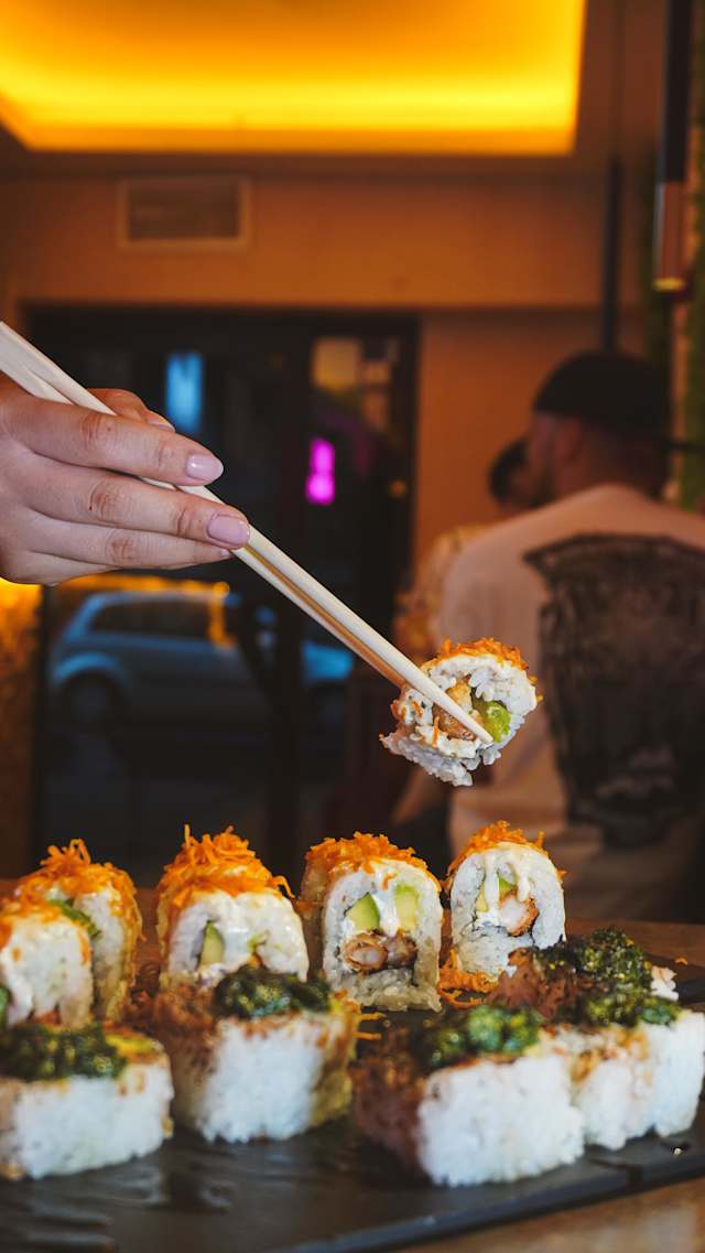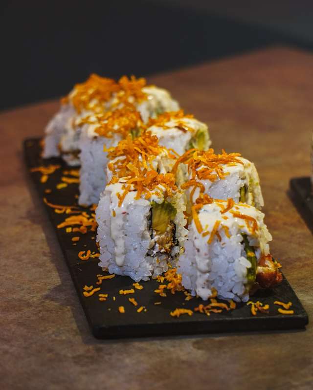 - Carne mechada, langostino, aguacate y queso crema con salsa de aji amanilo, mantequilla, anguila y de ají amarillo, mantequilla, anguila y sésamo: sabores ahumados.