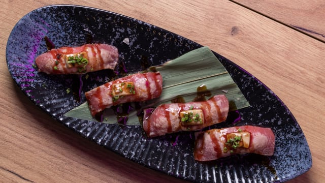 - Arroz de sushi con ternera flambeada, coronado con una suave capa de foie (2 unidades).