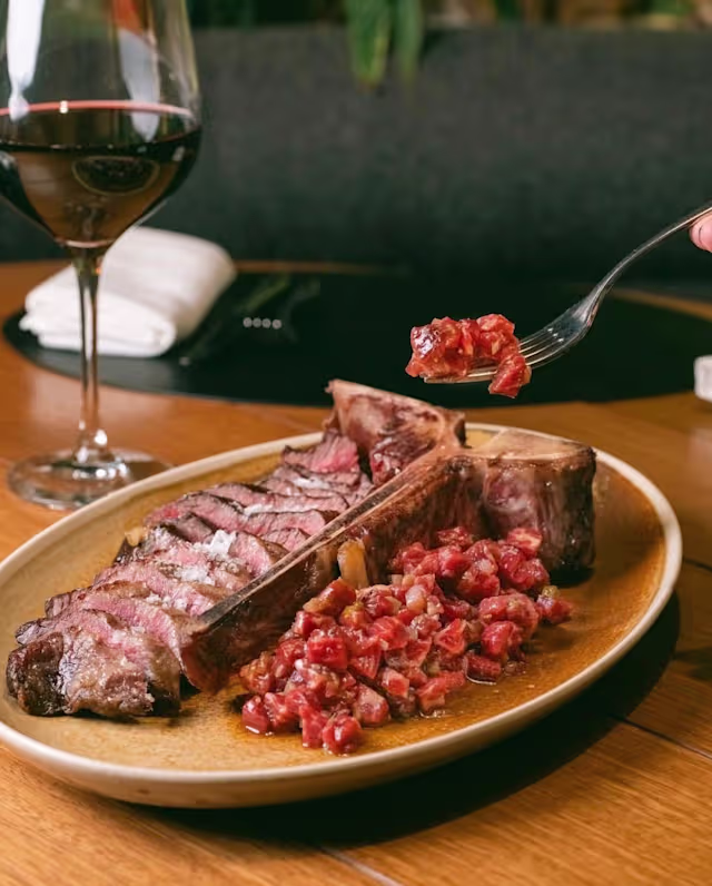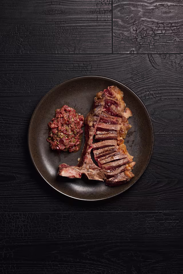 - T-bone de vaca vieja 30 días de maduración en dos experiencias: lomo a la brasa & solomillo en steak tartar