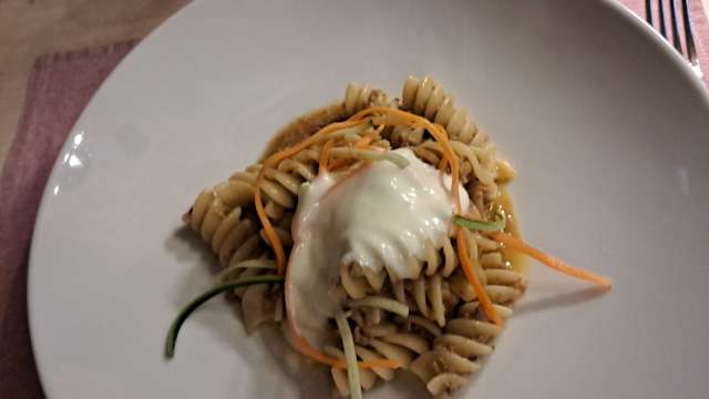 - Fusillone con ragù bianco di manzo, verdurine croccanti e spuma di caciocavallo podolico