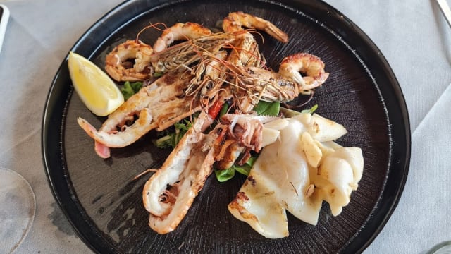 Tentacoli di totano ai ferri e pane condito alla siciliana(cepperi acciughe,pomodoro,olive,pecorino)