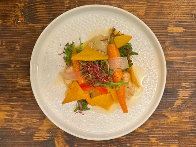 - Crema di porro alla vaniglia, crumble al pecorino, pomodori confit