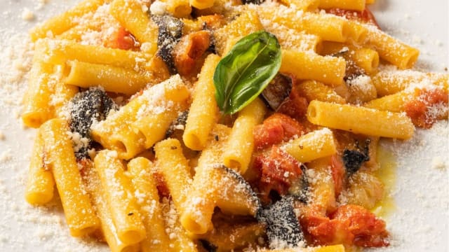 Ziti con sugo di pomodorini pachino, provola campana, melanzane e parmigiano grattugiato