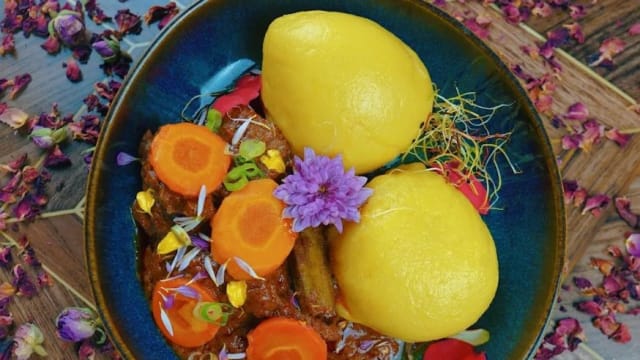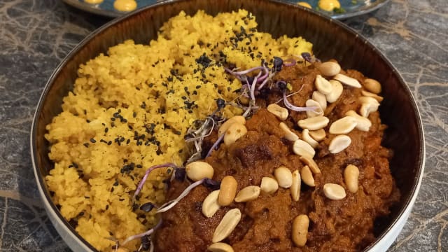 Mafé préparé à partir d'une pâte d'arachide artisanale et sublimé par un délicat mélange d'épices traditionnelles. Sa sauce onctueuse, longuement mijotée, enrobe avec finesse une viande de bceuf charolais sélectionnee pour sa tendrete et sa richesse en saveurs.