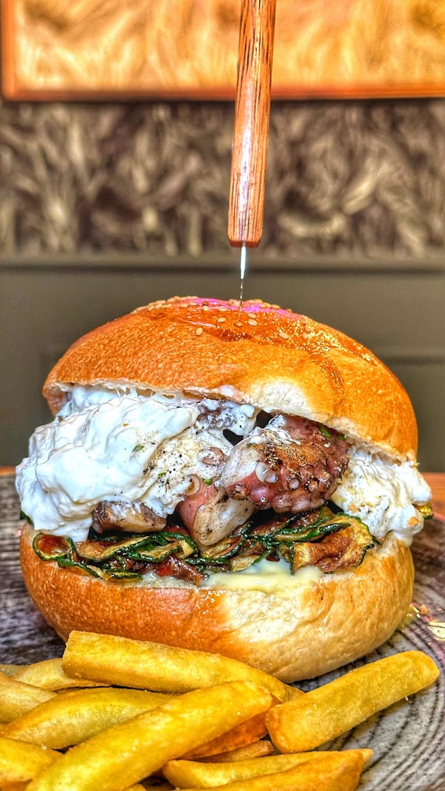 Hamburger di scottona 200gr, provola di agerola panata, zucchine alla scapece, scaglle di caciocavallo irpino, salsa burger