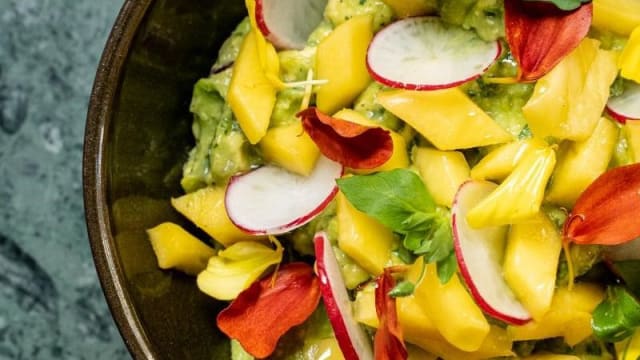 ceviche d'ananas mariné à l'hibiscus, crémeux avocat, crunchy quinoa