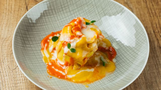 Raviolo* di burrata di andria con crema di lattuga romana e pinoli tostati
