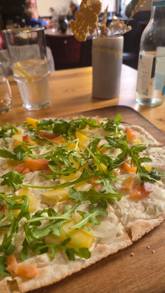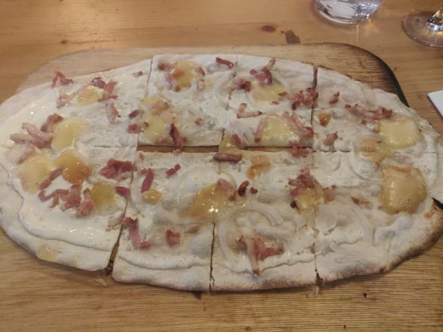 Dear client, Thank you for your kind words despite the late arrival of your "tarte flambée". We clearly made a mistake and are sorry for that. Thank you for still being positive and nice to us ! Best regards