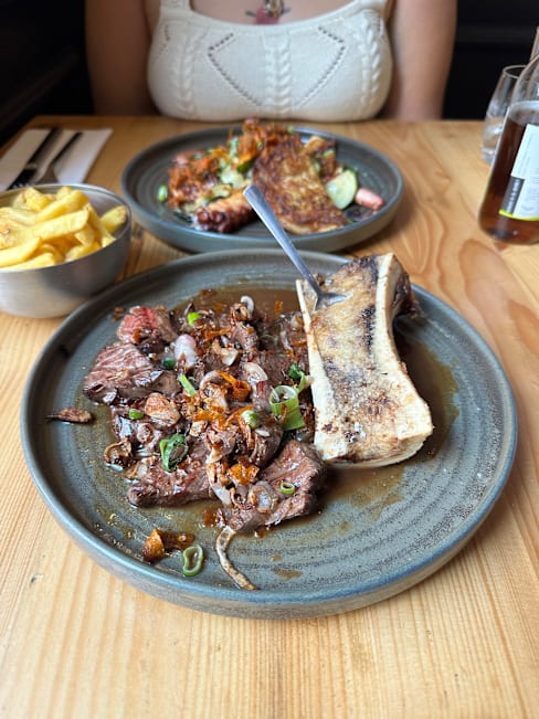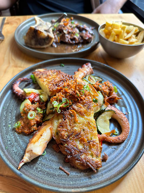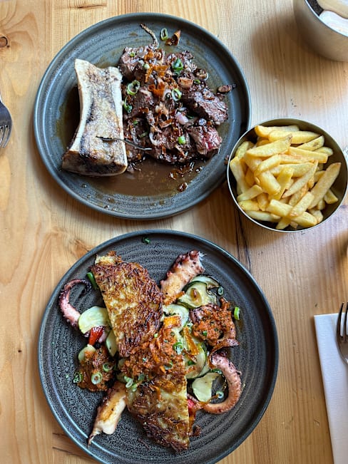 8.5/10Nice atmosphere and good service. The bread is good. The foie Gras was superb. My husband likes the steak with bone marrow and my son enjoyed his duck breast. The octopus I ordered was not the right texture and a bit bland though.