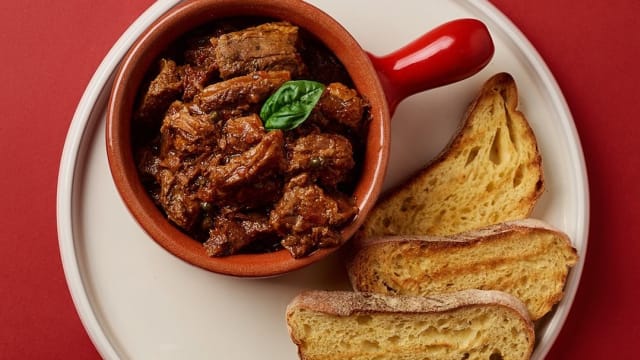 Sugo di pomodoro nostrano, teneri pezzetti di cavallo cotti a bassa temperatura, pangrattato tostato, stracciatella pugliese fresca e un tocco di basilico