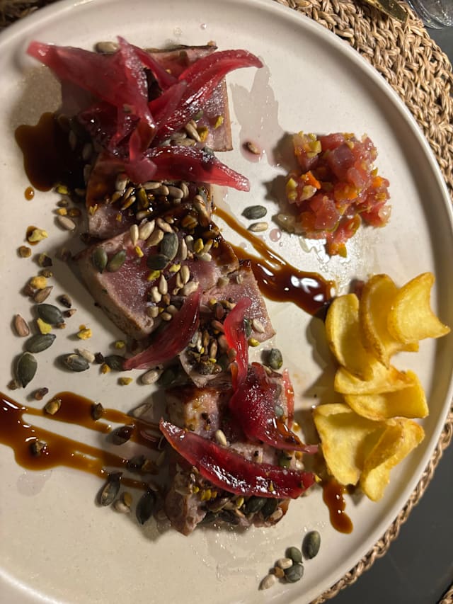 Un piatto fusion, dove il tonno scottato si sposa con la salsa terivaki e la croccantezza dei semi.