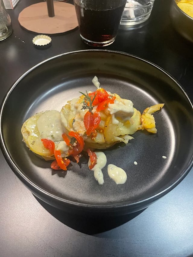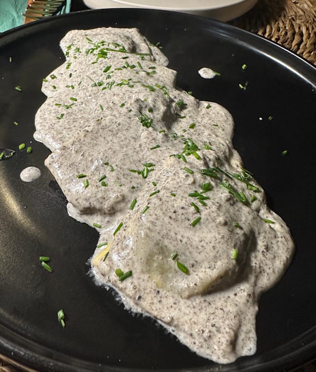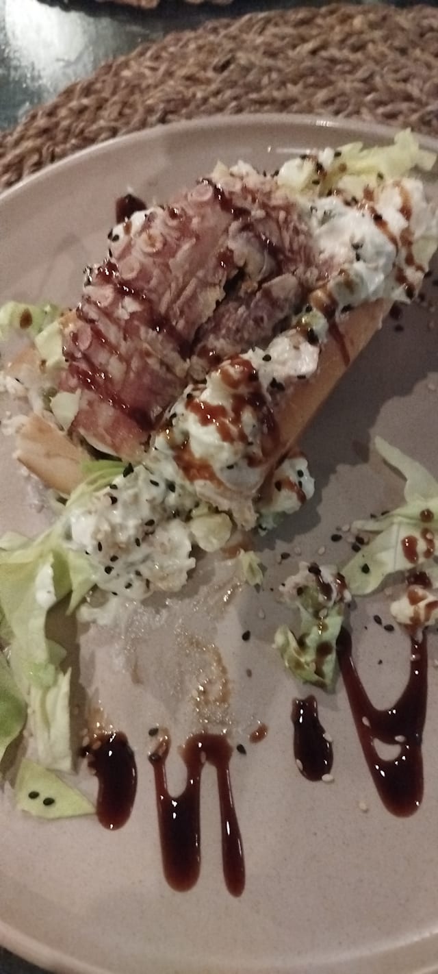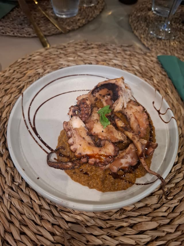 Un abbinamento audace ma riuscito, dove la tenerezza del polpo grigliato si sposa con la ricchezza della crema di parmigiana.