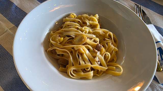 Crema di zucca, porcini, salsiccia, fior di latte, noci, scaglie di parmigiano, basilico.