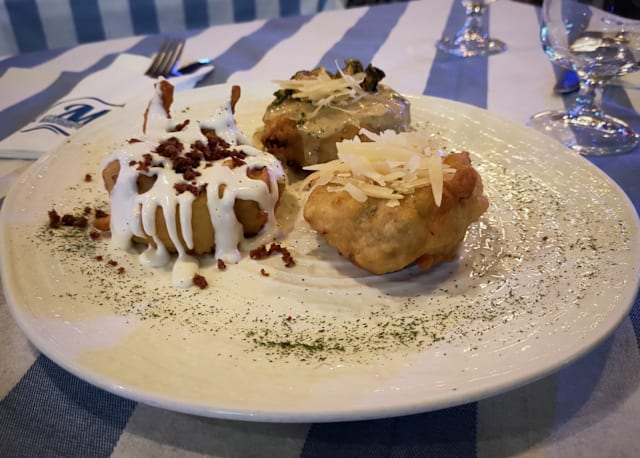 Gamberi fritti con verdure croccanti e maionese alle erbe