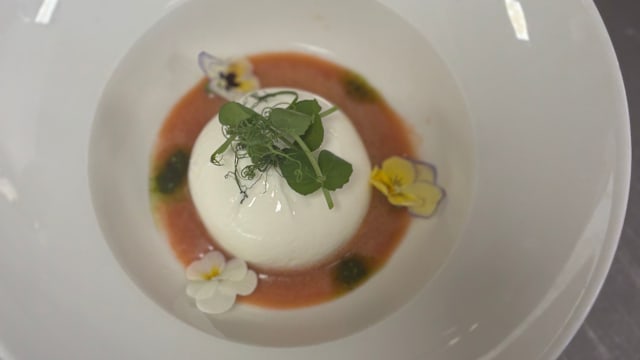 Sauce tomate italienne, fiordilatte, aubergines croustillantes et neige de ricotta salée