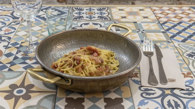 Mozzarella, nata, ou, bacó i pebre Mozzarella, nata, huevo, bacon y pimienta Mozzarella, white cream, egg, bacon and pepper