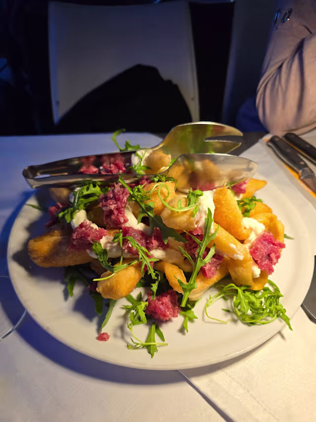 - Sfiziosi di pizza fritta, stracciatella sabelli, pachino fresco, rucola e crudo di parma