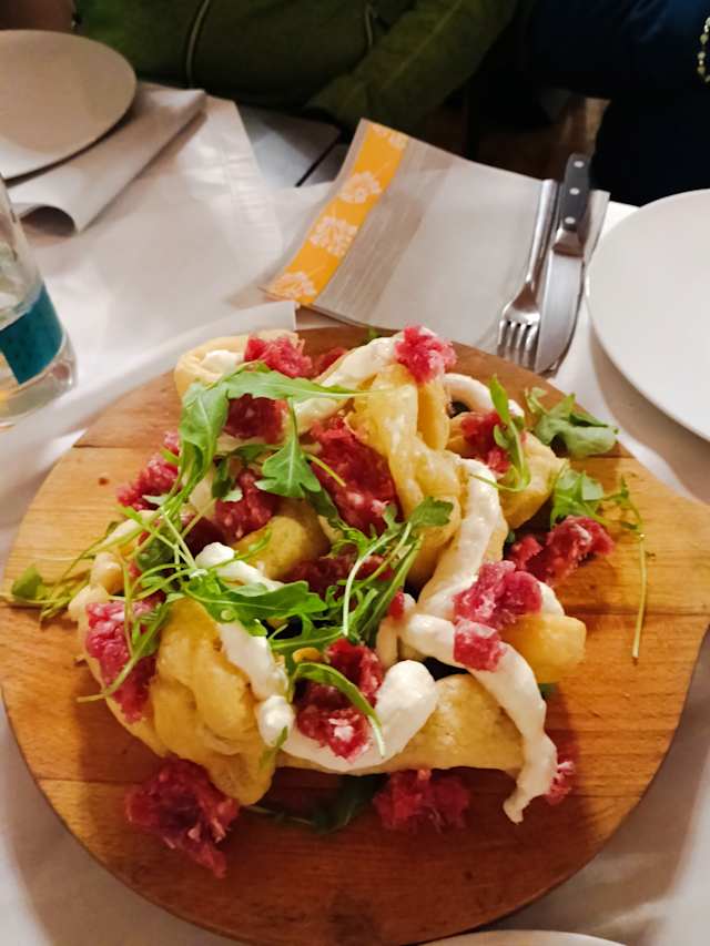 - Sfiziosi di pizza fritta, salsiccia di bra fuori cottura, crescenza e rucola
