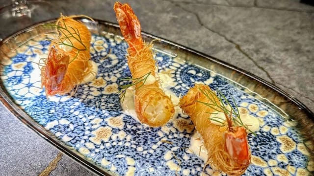(Gambero in pasta kataifi, cipolla marinata, salsa agrodolce e insalata croccante)
