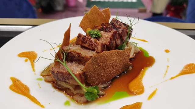 Polpo croccante con crema di carote, profumo di zenzero, patate alla paprika