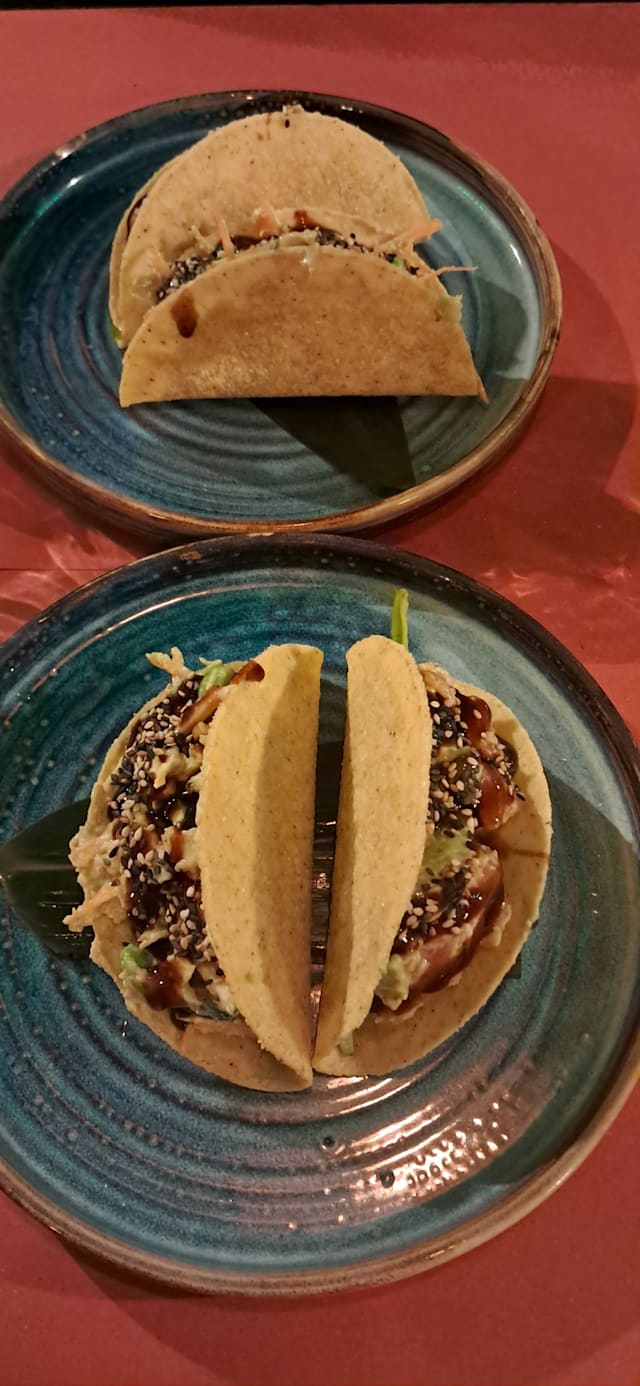 Tortilla croccante di mais con avocado, mais, carote, edamame, insalata e salsa cream cheese.