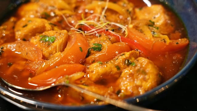 - (pollo en salsa de tomate, curry y con hiervas)