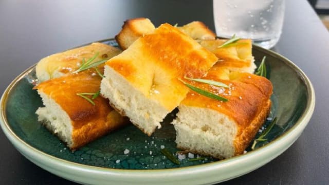 Focaccia, alecrim, meia burrata, pesto pistachio e azeite