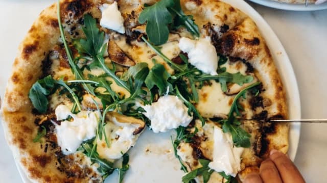 Creme de trufa, mozzarella fior di latte, cogumelos shitake, provolone, burrata e rúcula