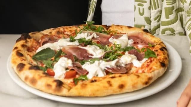 Molho de tomate, mozzarela fior di latte, burrata, presunto, tomate cherry, rúcula e azeite