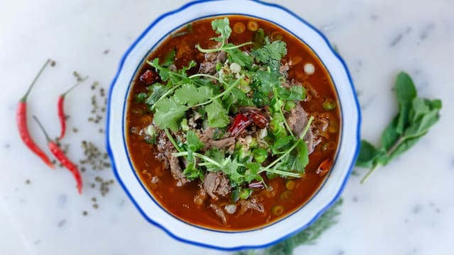 Förrätt - Kyckling m. grönsakssoppa eller Huvudrätt - Wokat nötkött m. bambuskott