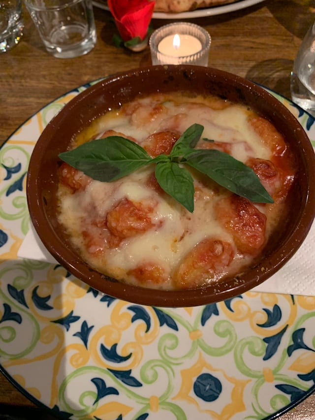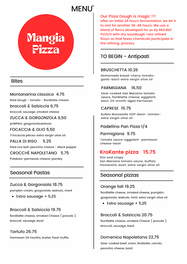 5.5/10this was my 4th time eating at Mangia with 3 previous experiences (also at their other location) which were very good. Unfortunately this one was different. we ordered 3 starters which they presented in 2 to start with and I think they wanted to do the 3th one as a intermediate dish. We ordered the fried rice ball or something like that and it was still frozen on the inside, the second time it was frozen as well and the 3th time we were given a croquette something like that which we believe was also not fully cooked. The parmigana en fried pizza dough were good though. as a main we shared a Pizza as they are usually amazing, but unfortunately this one was a bit too burned on some side of the crust. The waitress itself had a bit of an attitude instead of a nice warming welcome attitude. I would still recommend this place as the previous experiences were good and their pizza is really one of the best. Hopefully they can keep the quality as good as they have been doing.