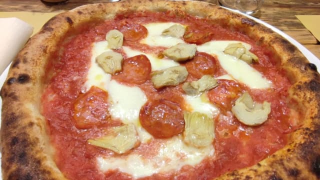 Passata di pomodoro giallo, olive nere, carciofi, funghi, rucola, olio EVO