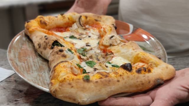 Salsiccia napoletana, bufala, pomodorini, funghi champignon, scaglie di grana e basilico, con cornicione di crema ai funghi misti