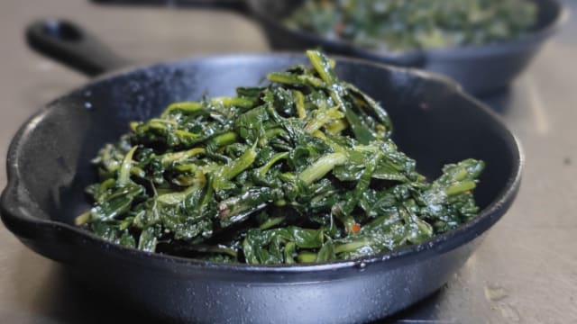 Polpo arrosticciato su scarola ripassata alla partenopea