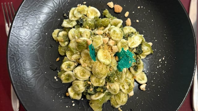 Le orecchiette si vestono di una crema vellutata al pistacchio e gorgonzola, arricchite da guanciale croccante e granella di pistacchio in uscita