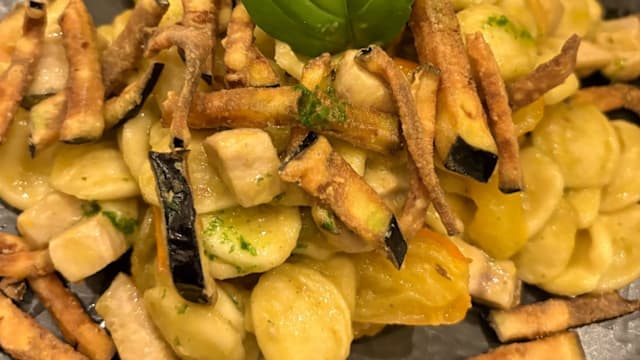 Orecchiette artigianali con datterino giallo, pesce spada scottato, salsa di melanzane, basilico fresco e guarnizione croccante di melanzane