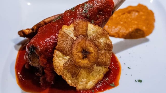 Chilindrón de cordero, tamal en cazuela, pimientos del padrón y tostones de plátano verde