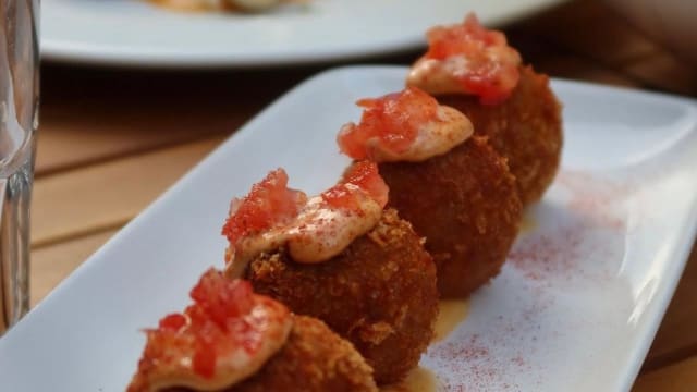 Croquetas de pernil de cerdo al horno, siracha y frutos rojos