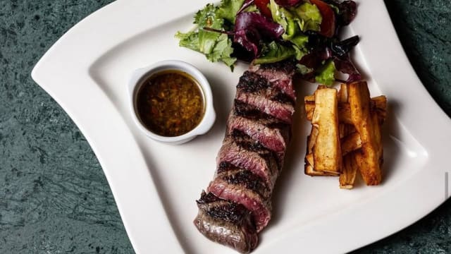 Solomillo de ternera (200gr) a la plancha y su chimichurri con yucas fritas