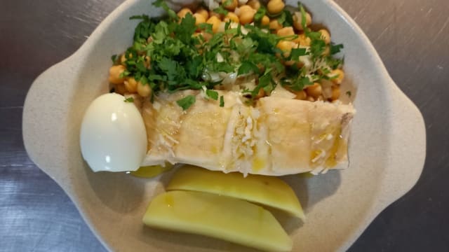Bacalhau confitado em molho cebolada com pimentos e batata frita