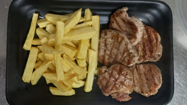 Bifinhos de porco, cogumelos natas batata frita e arroz