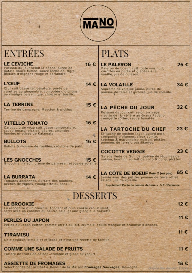 9/10Excellent meal. Creative and inventive especially the ceviche and the paleron de boeuf.