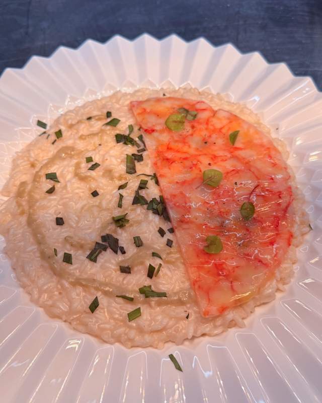 - Riso carnaroli riserva mantecato al beurre blanc, coulis d’ostrica con carpaccio di gambero viola e lime